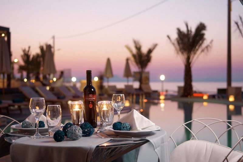 Das Hotelrestaurant Ariadne bietet ein Abendbuffet auf der Terrasse, tagsüber gibt es Snacks und Mittagessen in der Brasserie Loukoulos mit Blick auf das Meer und den Pool.